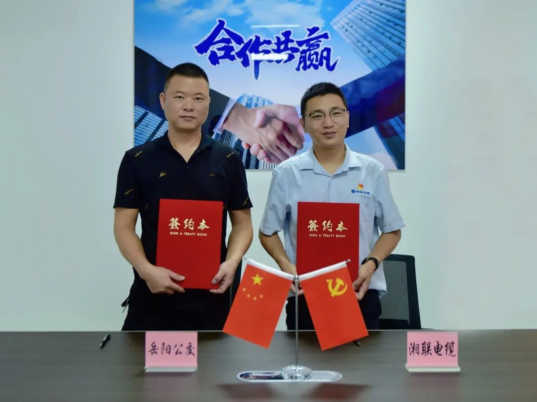 ▲湘聯(lián)電纜品牌總監(jiān)楊潔和岳陽市公共交通集團(tuán)李彪副書記代表雙方簽署合作協(xié)議