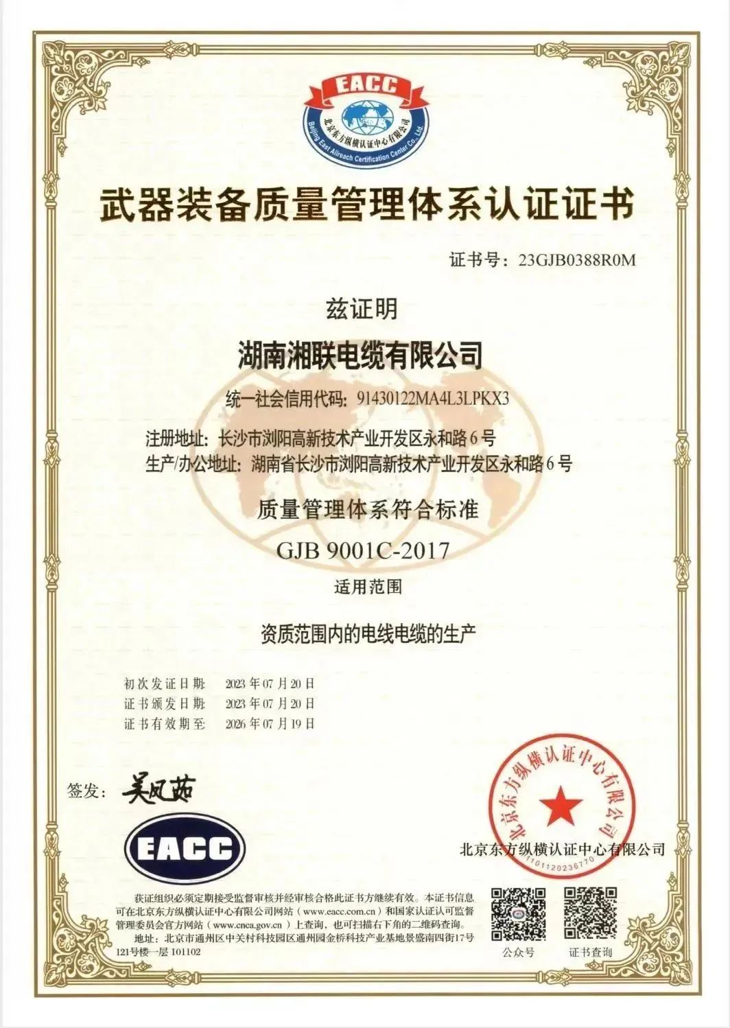 7月20日,湖南湘聯(lián)電纜有限公司順利通過國軍標(biāo)質(zhì)量管理體系認(rèn)證,獲得《武器裝備質(zhì)量管理體系認(rèn)證證書》,質(zhì)量管理體系符合:GJB9001C-2017標(biāo)準(zhǔn)。