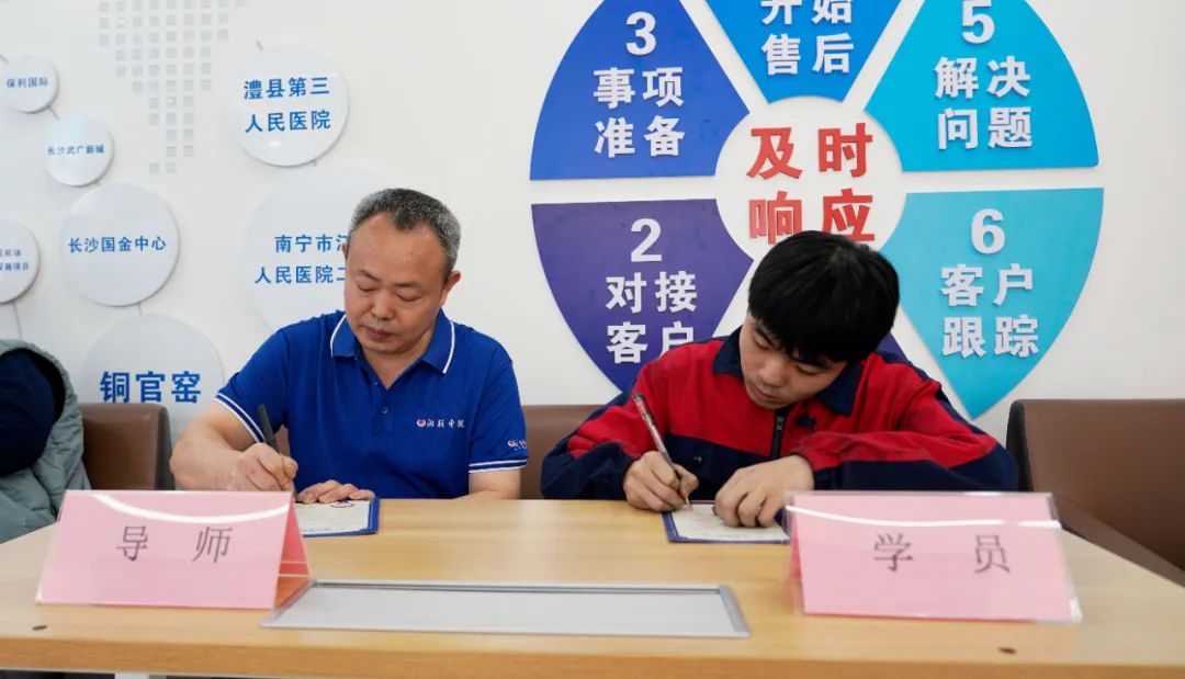 2024年“芯”火計(jì)劃選取了工作責(zé)任心強(qiáng)、技術(shù)能力過硬、工作經(jīng)驗(yàn)豐富的管理人員作為培訓(xùn)講師,根據(jù)7位青年職工的崗位技能需求和講師的專業(yè)領(lǐng)域,分崗位系統(tǒng)化、有針對性地對7位徒弟進(jìn)行技術(shù)知識(shí)、技能實(shí)操以及工藝管理等方面的培訓(xùn)。在開班儀式上,講師和學(xué)員通過簽訂師徒帖、發(fā)表宣言、獻(xiàn)花等環(huán)節(jié),隆重完成師徒結(jié)對儀式,形成緊密和諧的師徒關(guān)系。