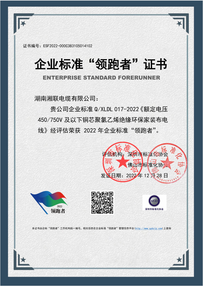 近日,湖南湘聯(lián)電纜有限公司企業(yè)標(biāo)準(zhǔn)Q/XLDL 010-2022《額定電壓 6kV(Um=7.2kV)到 35kV(Um=40.5kV)擠包石墨烯內(nèi)外屏蔽交聯(lián)聚乙烯絕緣電力電纜》、Q/XLDL 016-2022《額定電壓 1kV(Um =1.2 kV)擠包絕緣電力電纜》、Q/XLDL 017-2022《額定電壓450/750V及以下銅芯聚氯乙烯絕緣環(huán)保家裝布電線》三項產(chǎn)品經(jīng)評定機(jī)構(gòu)評估,榮獲2022年全國企業(yè)標(biāo)準(zhǔn)“領(lǐng)跑者”。
